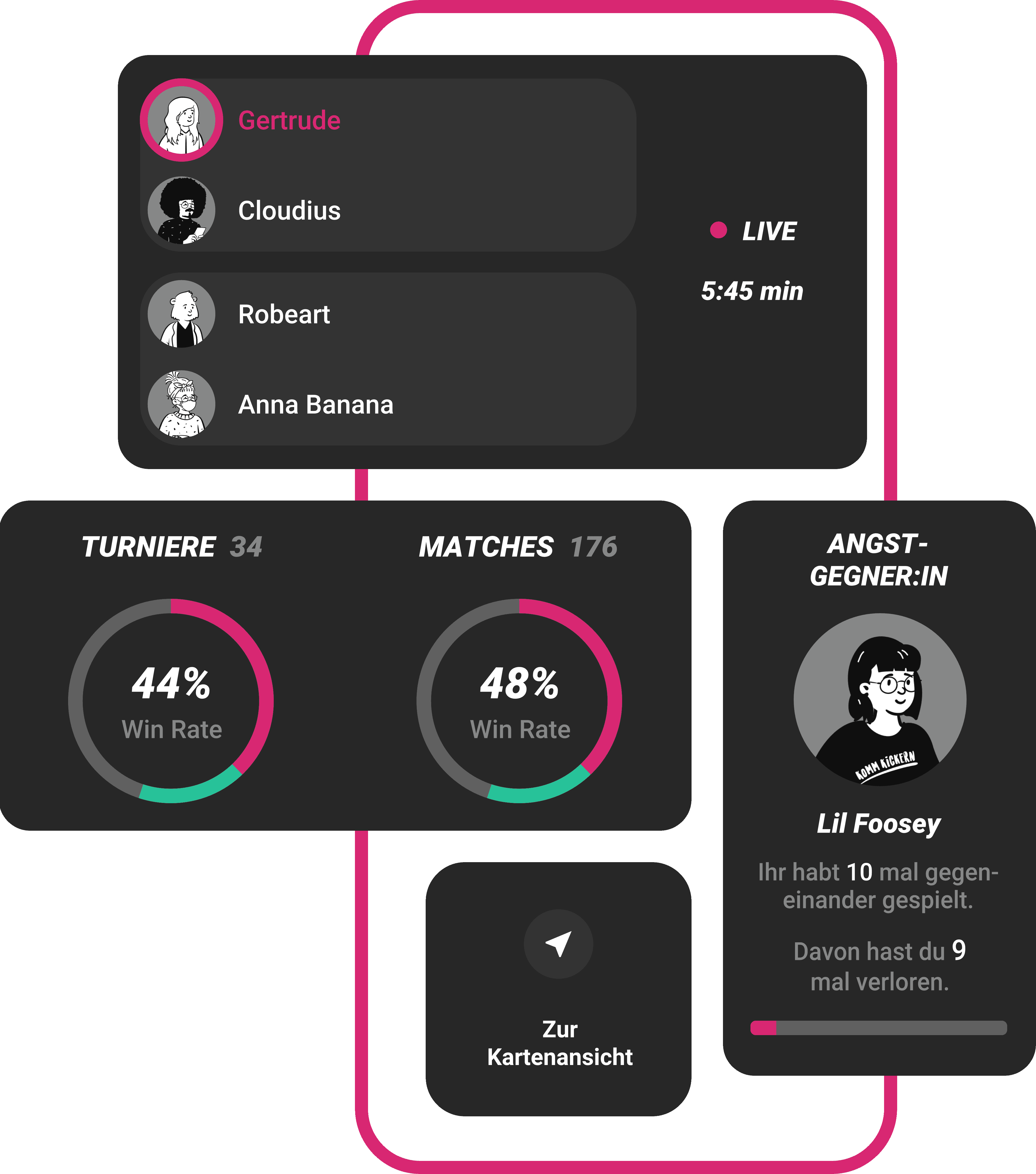Finde Turniere in deiner Nähe und messe dich mit anderen Spieler:innen. Global, National, Regional oder Local Hero - mit Ranglisten geizen wir nicht und Fleiß wird auch belohnt.